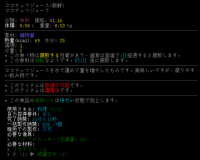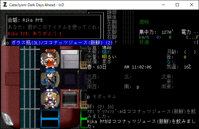 ココナッツジュースを製作して仲間に配りました。CataclysmDDAにタピオカミルクティーを登場させたら満喫とカロリーはどうなるんだろう。俺はタピオカミルクティーに詳しくないので計算できません。
