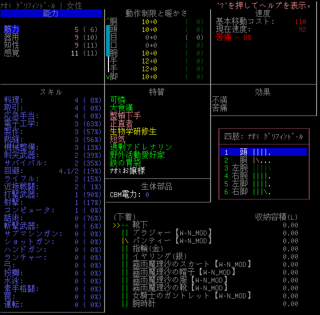 ナオミちゃんの能力値は上の画像。胴体部位の傷が酷いので休息させるべきだな。俺がフレンドリーファイアをしたせいだから申し訳ない。これだけ傷を負っても過剰アドレナリンの特質は発動しないようです。
