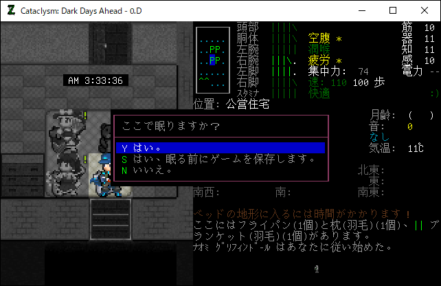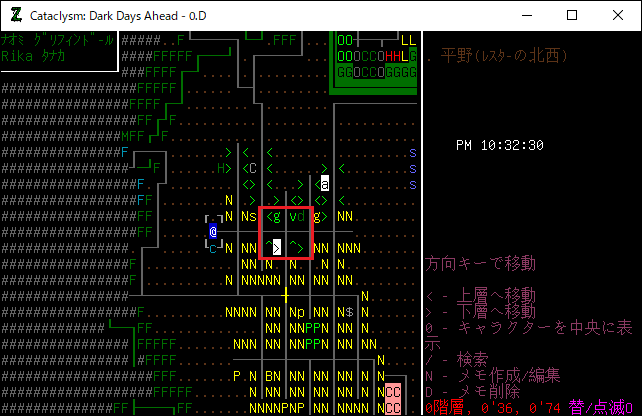 Cataclysmのプレイ日記を始めます。現在の時刻はPM10:32だ。今夜はこのまま夜間探索に行くぞ。懐中電灯をオンにしながら日付が変わるまで歩き続けよう。