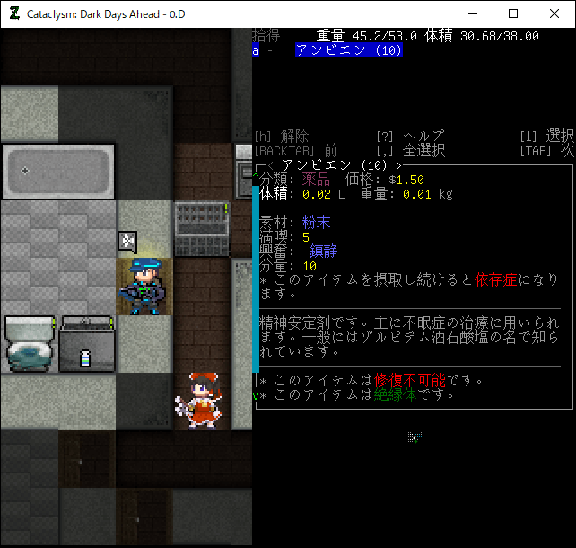 トイレにて『アンビエン』を拾いました。説明文によると強力な睡眠薬みたいですね。CataclysmDDAで睡眠薬を使う機会なんてあるのかなあ。カフェインをガブガブ飲んで夜通し作業をしたくなるくらいだし。