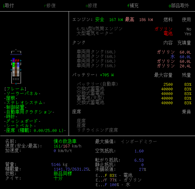 救急車の性能は上の画像。積載量が1141リットルになっているだと?山小屋を出発してから800リットルも増えていやがる。明後日の探索で積荷スペースがパンパンになり山小屋に戻ることになるかもしれません。