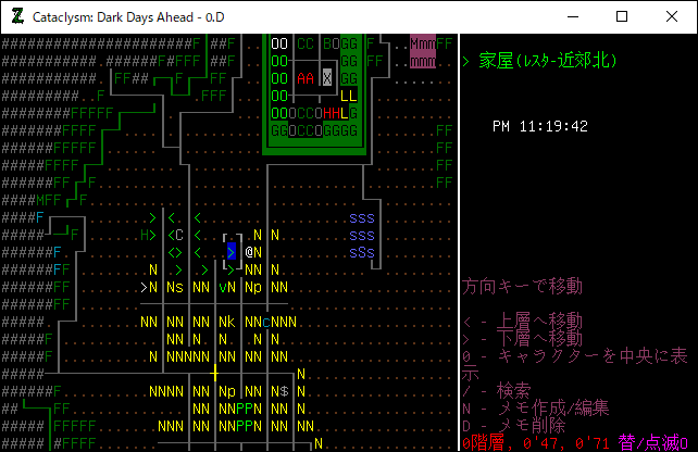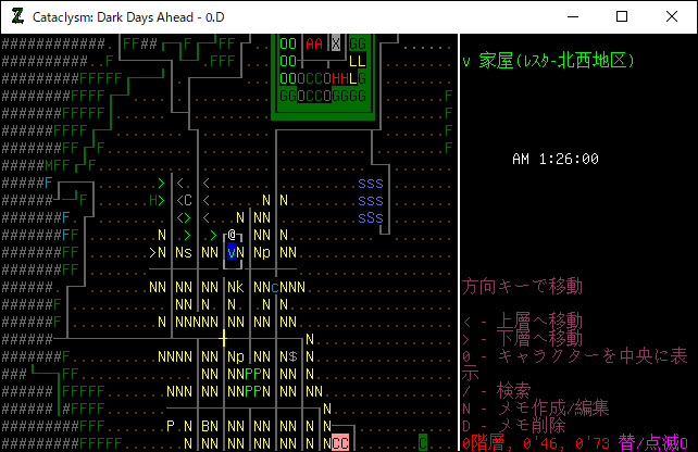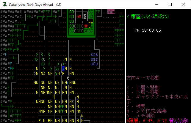 Cataclysmのプレイ日記を始めます。現在の時刻はPM9:29だが、まだまだ家屋を調べ歩くぞ。今回はレスター近郊北区の東側をひたすら歩きます。アイテムの拾い忘れが無いように懐中電灯は常時オンにするのだ。