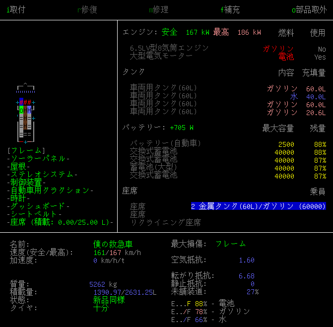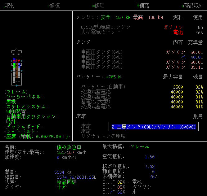 救急車の性能は上の画像。積み込んだ荷物が1390Lに達しています。明日の朝になったら積荷スペースを外付けしよう。たぶん今のままではレスターに落ちているアイテムを全て収納できない。