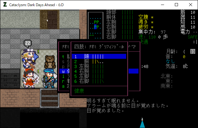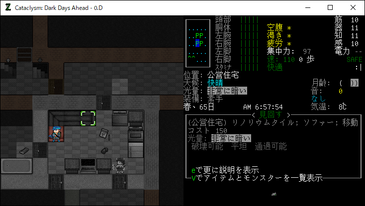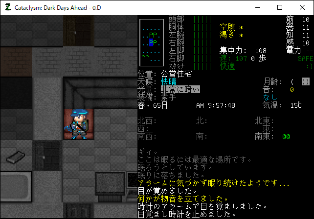 Cataclysmのプレイ日記を始めます。今日の探索でレスターを完全制圧しよう。つーか、朝日が眩しすぎて充分な睡眠をとれなかった。3時間くらいしか眠れなかったんだけど!