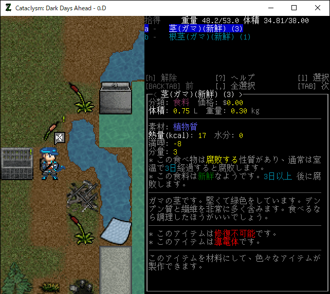 水源の近くで『ガマ』という植物を発見しました。『e』コマンドを押すと採取できるようだぞ。何が手に入るのか調べてみましょう。