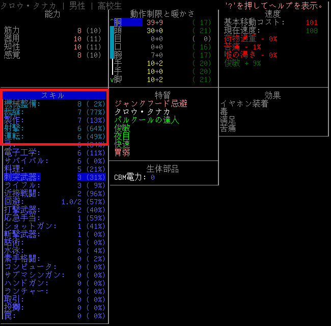 現在の能力値は上の画像。本スレを読んで知ったのだけど、スキル成長のオンオフが可能みたい。能力値の画面でEnterキーを押せばオンオフ切り替えられます。今後は成長させたいスキルだけに『集中力』を振り分けよう。
