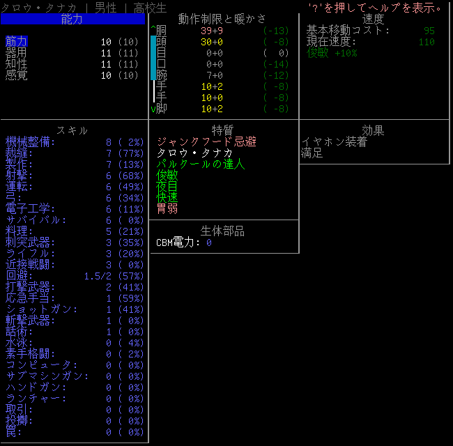 探索が終わったしメンバーの装備と能力値を確認しよう。タロウ・タナカの能力値は上の画像。これからはNPCと会う機会が増えると思われるので話術スキルや取引スキルを鍛えたい。