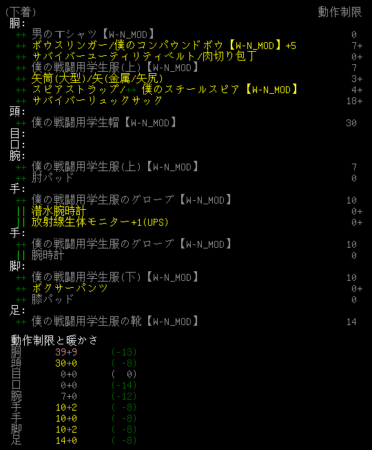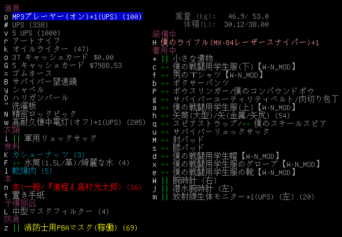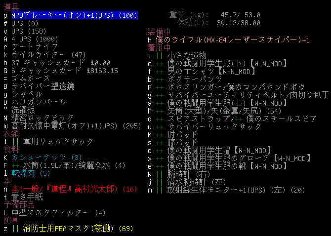 出発時の所持品と装備品は上の画像。53.0kgしか持てないのが不便に感じてきた。折り畳み式カートを持ったら重量の限界を超えます。機械整備スキルを鍛えて腕力を11に上げたいな。
