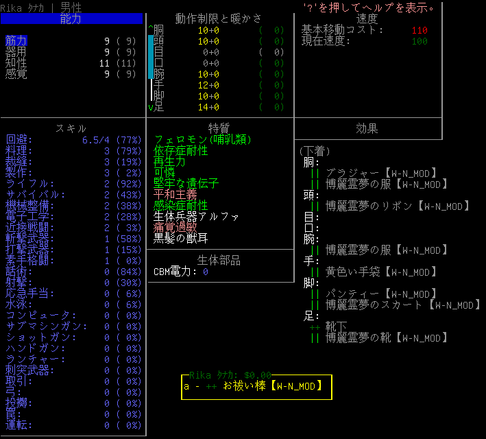 ケモミミの能力値は上の画像。頭部の装備はキチンヘルメットの着用部位を『頭』だけに減らしたものになる。目と口の動作制限を下げないとガスマスクを渡した際に頭部の装備を外してしまうのです。