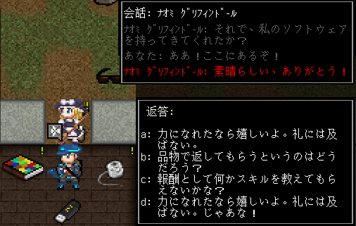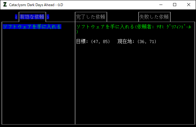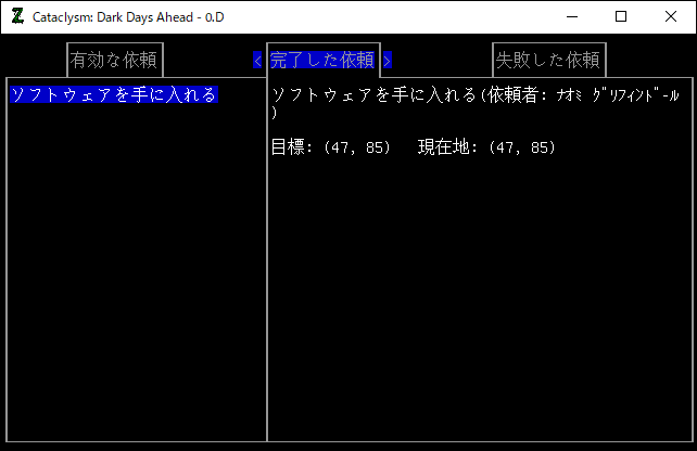『M』コマンドで依頼の画面を確認します。無事に『ソフトウェアを手に入れる』依頼が達成されたようです。NPCからの依頼はたまにバグが発生するらしく、不具合っぽい挙動をしたら躊躇せずデバッグモードを使った方が良いらしい。