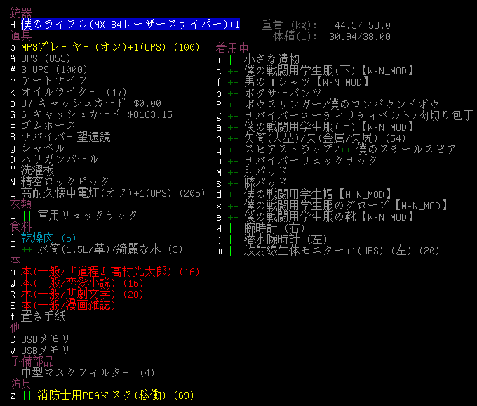 出発時の所持品と装備品は上の画像。山小屋に帰ったらUPSを大量生産しないといけない。地域運営学校を攻略する前に金属製の矢を300本ほど用意するべきだろう。やらなければいけない事が多すぎて頭がおかしくなりそうだよ。