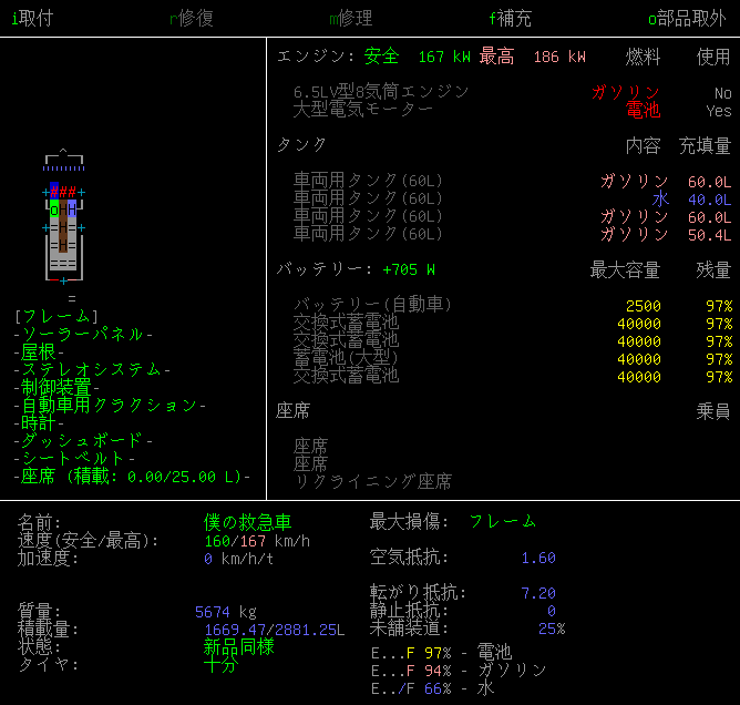 救急車の性能は上の画像。レスターの攻略が完了したので今後は大規模な遠征をすることになる。大型蓄電池の増やさないと荒野で立ち往生してしまうぞ。タレット台も設置したいし満足のいく車両にするには時間が掛かりそうです。