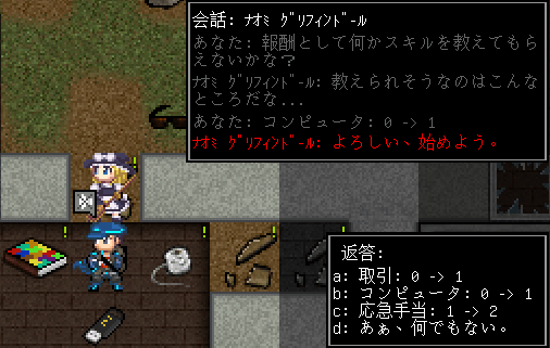 ナオミちゃんから指導を受けてコンピュータースキルが1になりました。これでナオミちゃんと同じようにコンピューターを扱えることができます。たかがスキルレベル1だからセキュリティのハッキングは無理だけどね(笑)。