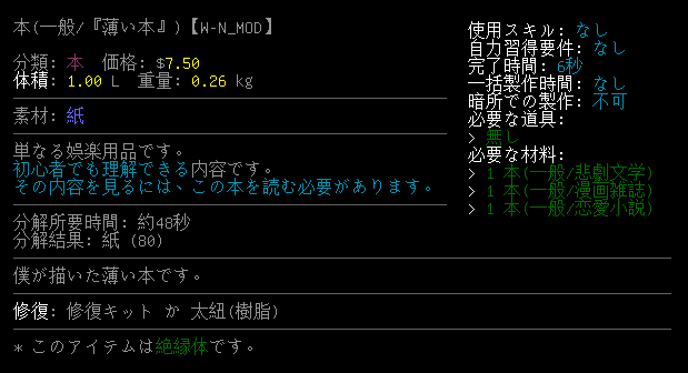 お世話になっている仲間のおうちに来たのだからお土産を置いておこう。『漫画雑誌、悲劇文学、恋愛小説』を参考にして『薄い本』をクラフトします。こんな本をコミケで並べても売れないだろうが、個人的なプレゼントなら問題は無いはずだ。