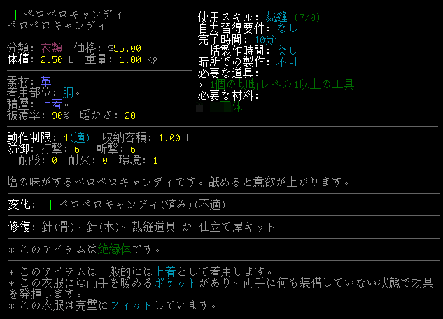 ペロペロキャンディを製作して身に付けました。ぶっちゃけ動作制限が激増するし防具にするのは現実的ではない。ペロペロキャンディの神髄は『使用』することで発揮されるのである。