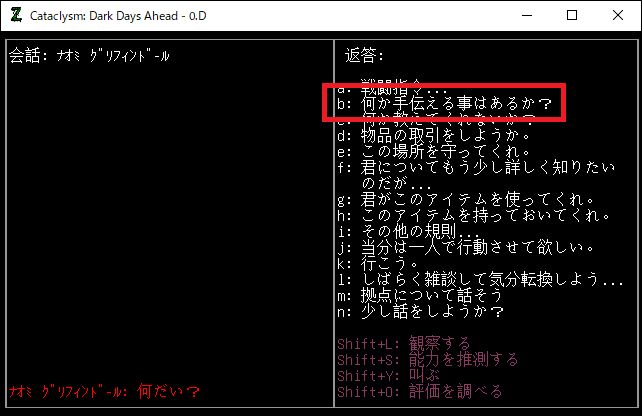 会話画面の『b:何か手伝える事はあるか?』を選択するとクエストの受領が可能になります。ナオミちゃんには最序盤からレスター攻略を手助けしてもらい感謝している。あとでケモミミの願いも聞くつもりだが、ひとまずはナオミちゃんからだな。