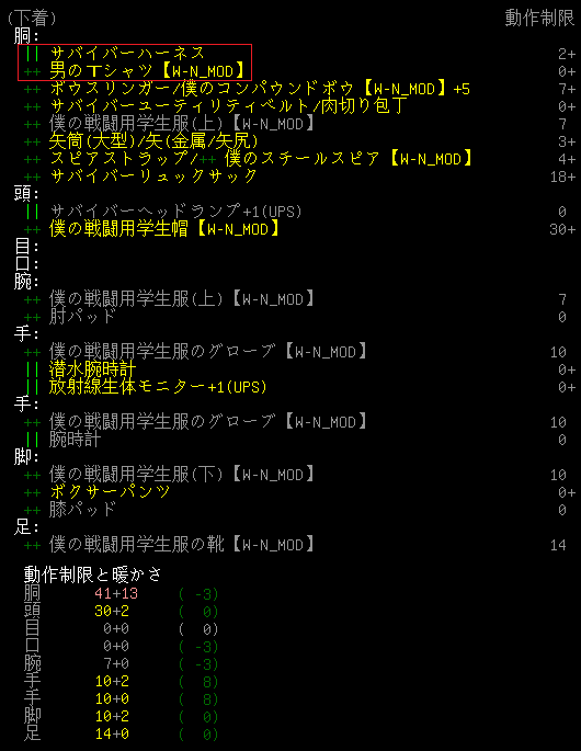 タロウ・タナカの防具と動作制限は上の画像。『サバイバーハーネス』と『男のTシャツ』を入れ替えれば動作制限が2下がります。困った事に入れ替えると男のTシャツのタイルが隠れてしまうのだ。重ね着ペナルティはあえて受け入れる事にした。