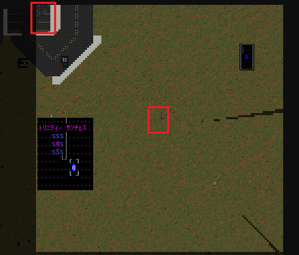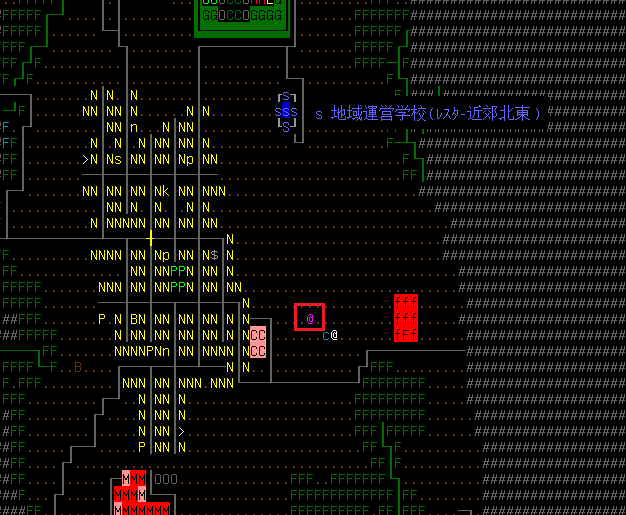 地域運営学校は現在地から真っ直ぐ北へ進んだ場所にあります。それはそうと山小屋の近くにピンクの『@』がありますねえ。これってランダムNPCが山小屋に近づいて来たってことだよな。