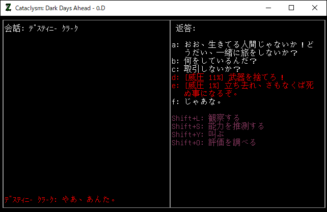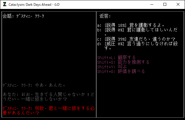一緒に旅をしないか誘ったところ上の選択肢が表示されました。表示されているパーセンテージは成功率だよな。『c:』の『友達だろ、違うのか?』が成功すると仲間になるようです。説得に失敗したら撃ち○します。