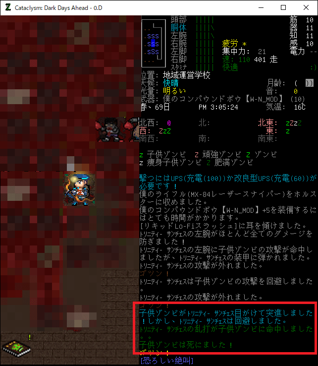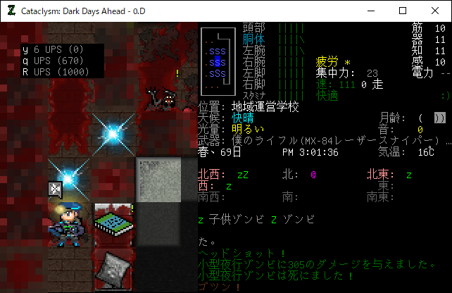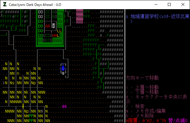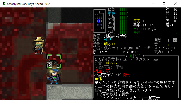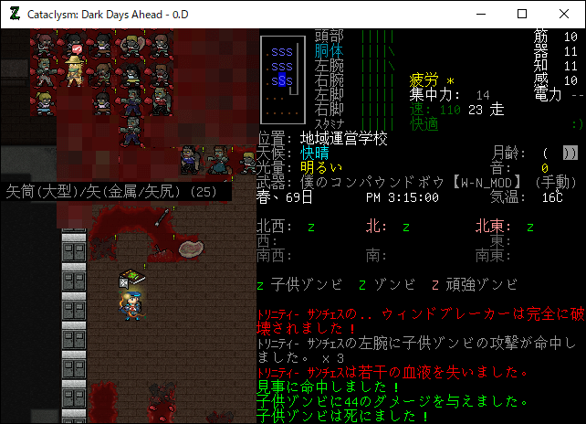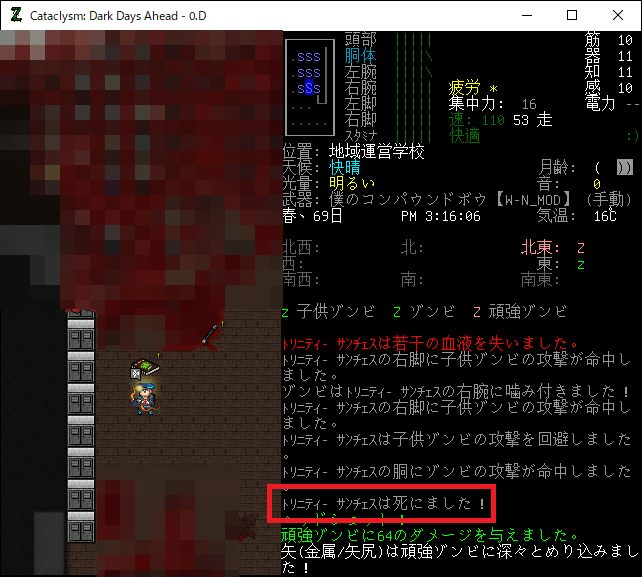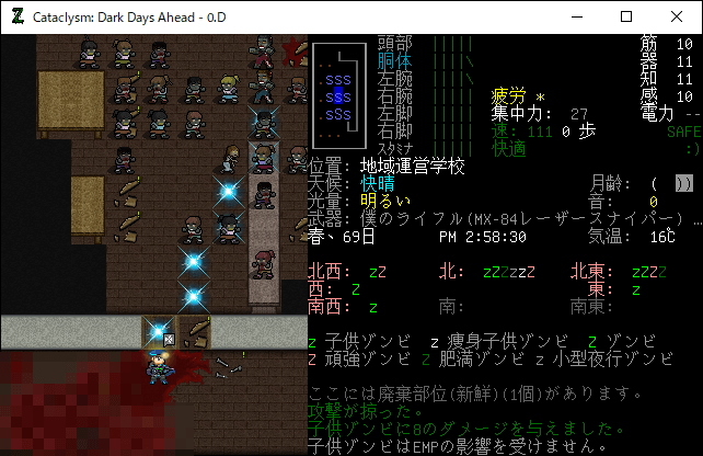 Cataclysmのプレイ日記を始めます。地域運営学校の中に侵入してNPCと合流をしたよ。予想していたよりもゾンビの数が多くて窮地に陥ってしまった。子供ゾンビは弱いからギリギリ勝てると思うんだけどなあ。