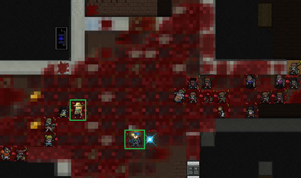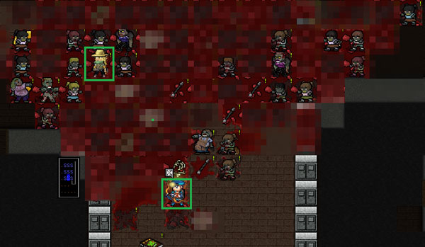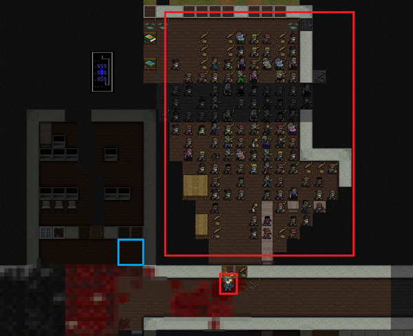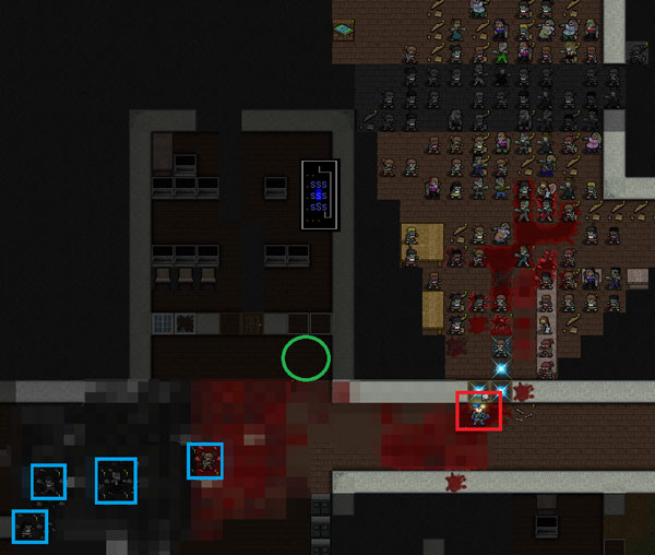 なにげなく開けた部屋の中にとんでもない数のゾンビが待ち構えていたのだ。現在地が野外ならば余裕で勝てるのになあ。狭い廊下でNPC(青い四角の場所にいる)を守りながら全滅させるのは至難の業だろう。