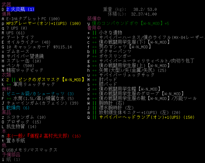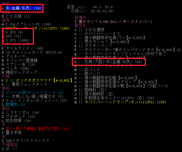 今回はここで中断して頭を冷やします。現在の所持品と装備品は上の画像。UPSを大量生産すればトリニティーを救えただろうか?改良型UPSと原子力電池さえあれば勝てたとは思う。