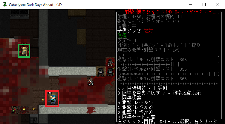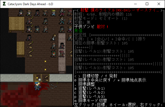CataclysmDDAはゾンビに隣接されると射撃がほぼ不可能になります。東西の敵を交互に倒さなければどちらかの敵に隣接されてしまう。もう俺1人の力では打開できないかもしれない。NPCの戦闘力に期待するしかないかもね。