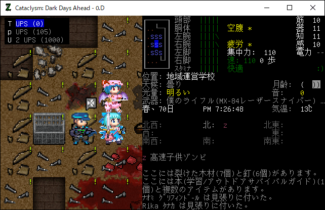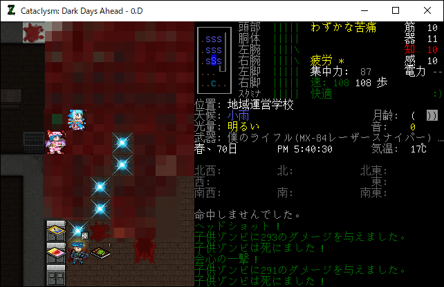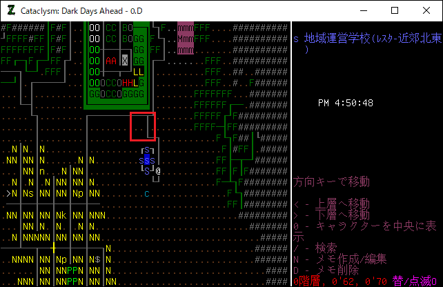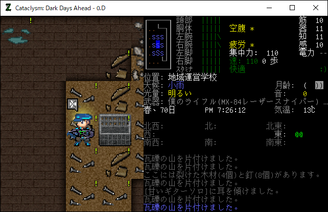 Cataclysmのプレイ日記を始めます。前回は学校の外を掃除して安全にしました。これより屋内のアイテムを回収します。
