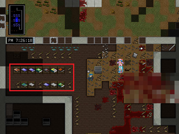 瓦礫はシャベルなどを所持した状態で『e』を押すと撤去可能だ。壊れた家具の下に大量の学習本が落ちていました。どうやらゾンビはアイテムの破壊まではしないらしい(たぶん)。