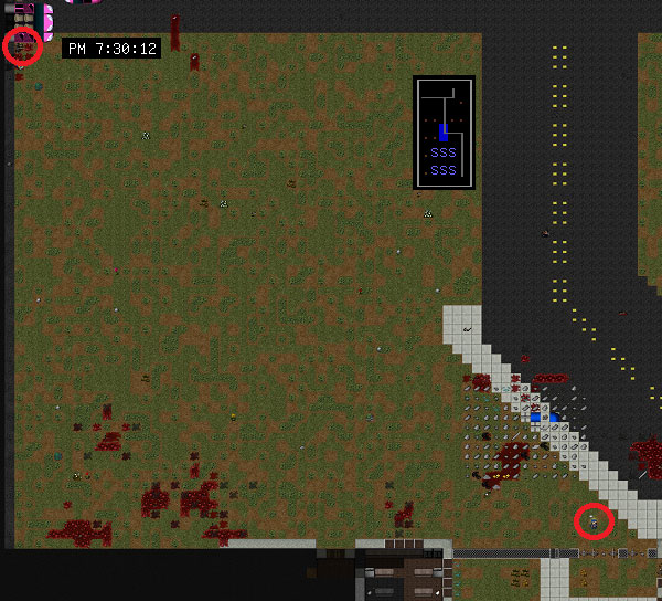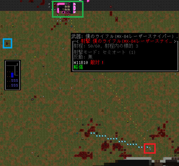 超人工兵ゾンビは『無視』状態のようです。こいつはこのまま放置しておくべきだな。討伐するのは可能だけど倒した後に死体を解体する必要がある。解体のために北へ進んだら、また州兵基地のロボットが生成されてしまう。