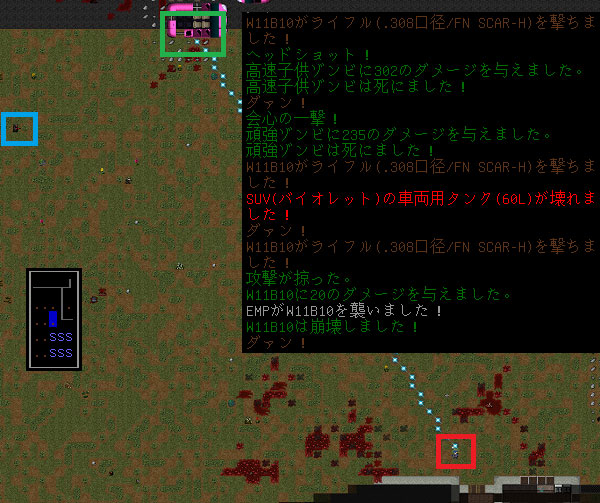 やったぜ!遠すぎて20ダメージしか与えられなかったけどEMPのおかげで倒せた!奴は車内にいたから自動車が盾になるんじゃないかと不安だったあ。あとは超人兵士ゾンビさえ無力化すれば学校の探索は安泰だ(青い四角の場所にいます)。