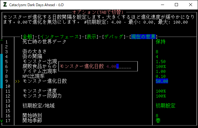 そうだ思い出した!モンスター進化日数をデフォルトの4日に設定したかったのだ。本当ならレスターを制圧した直後に変更する予定だった。結局、数ヶ月間も放置しちゃったよ(笑)。