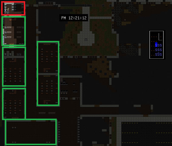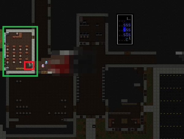 ロッカーが並んだ倉庫は上の画像の赤い四角だ。緑の四角は探索済みの教室でジャンクフードばかり置いてあった。どこかに保険室とか無いかなあ。俺は聴診器が欲しいんだよ。
