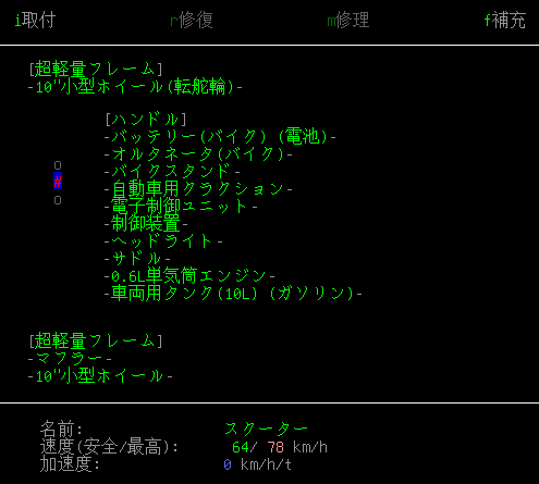 地域運営学校の攻略は大変だった(11投稿目)。学校のアイテムを拾うだけでは退屈だからバイクの部品も漁ります。別のセーブデータでガソリンエンジンのバイクを調べてきました。