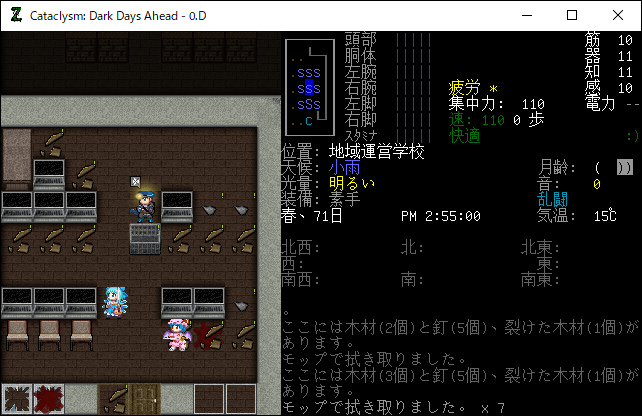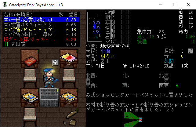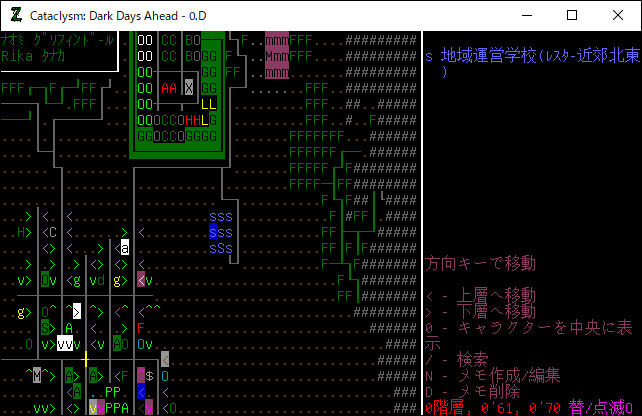 Cataclysmのプレイ日記を始めます。今回の投稿で地域運営学校の探索を終わらせよう。もうゾンビは存在しないし歩き回るだけでアイテムを回収できます。時間が余ったら山小屋でクラフトをしたい。