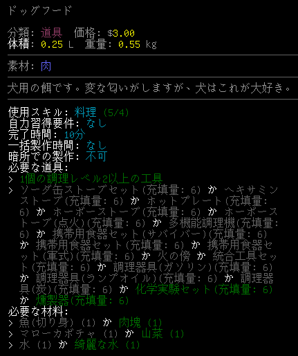 ドッグフードのクラフトに必要な道具と素材は上の画像。意外にも使用スキルが料理4と高い(笑)。肉と山菜を混ぜるだけだから簡単そうなのにね。