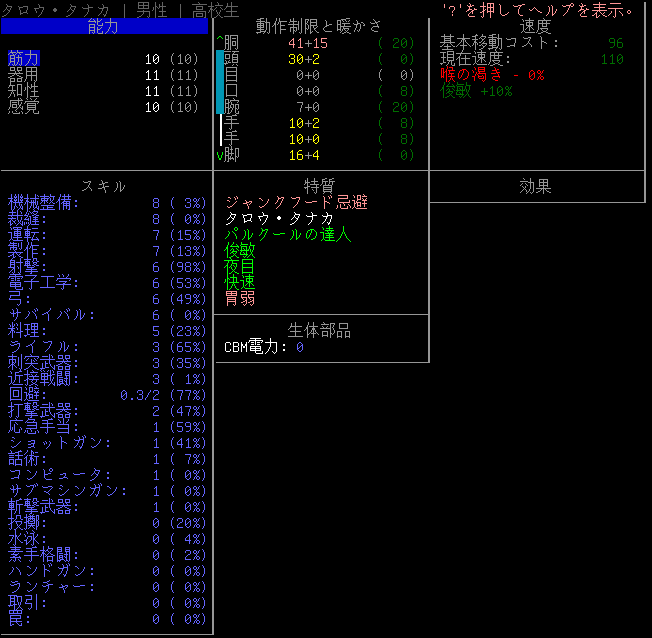 現在の能力値は上の画像。タロウ・タナカの機械整備スキルは8もあります。これならバイクラックの製作やバイクの組み立ては余裕だろう。
