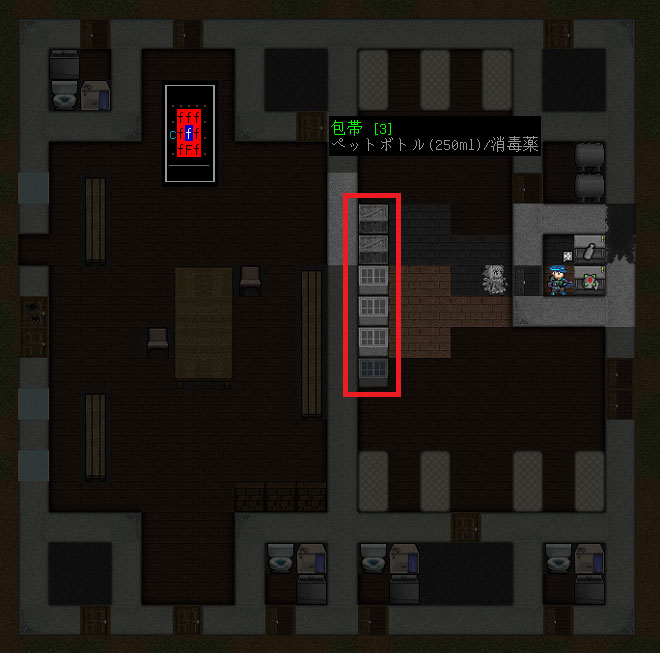 医薬品の置いてある部屋を発見しました。この建物のアイテムも包帯や消毒薬など平凡な物だけです。部屋の隅に置いてある木箱は制圧した後に調べましょう。