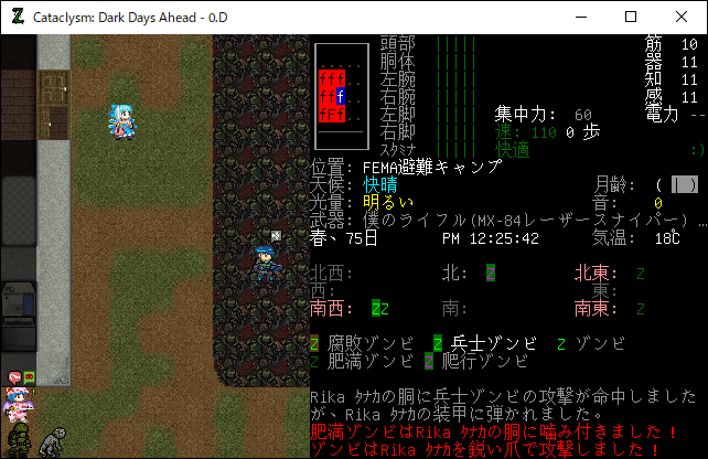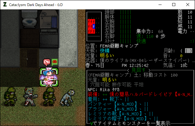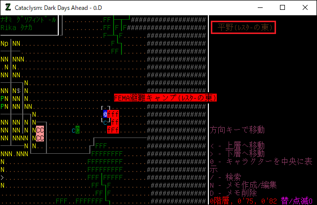Cataclysmのプレイ日記を始めます。FEMA避難キャンプの攻略を開始しました。今のところ遭遇したゾンビは雑魚ばかりだ。施設内の様子もよく分からないので慎重に攻略したい。