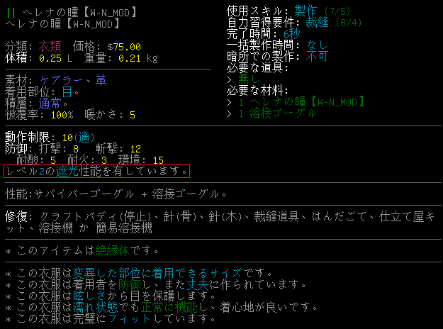ヘレナの瞳と溶接ゴーグルを合体させます。このクラフトによりヘレナの瞳がレベル2の遮光性能を得るのだ。jsonに『 "qualities": [ [ "GLARE", 2 ] ]』を書いただけなのだが。