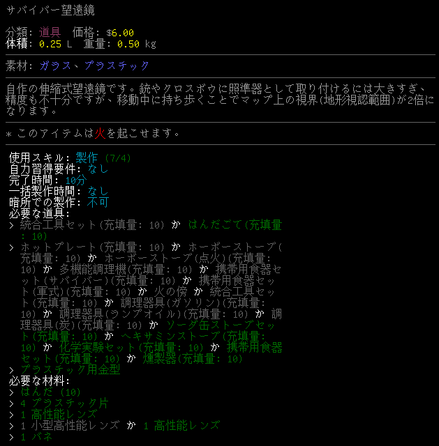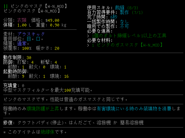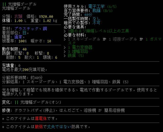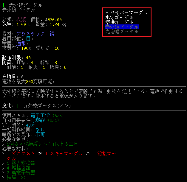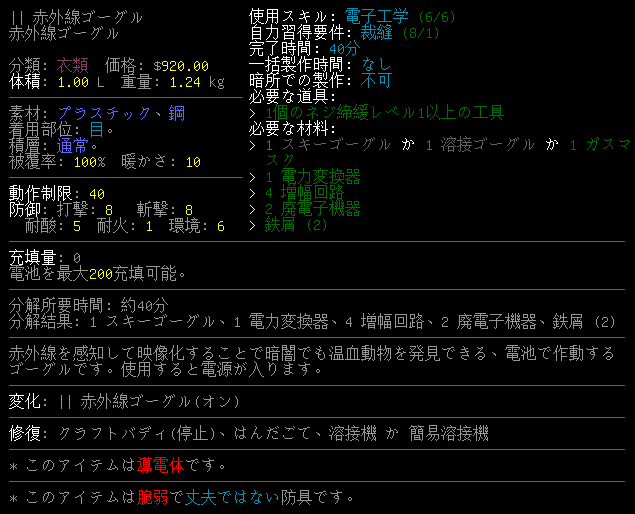 CataclysmDDAには面白そうな装備が沢山あります。例えば上の『赤外線ゴーグル』や『光増幅ゴーグル』とかね。しかし、使い所が難しいため普通にプレイをしていたら出番は無いだろう。赤外線ゴーグルや光増幅ゴーグルをUPS化して持ち歩くなんて面倒くさすぎる。