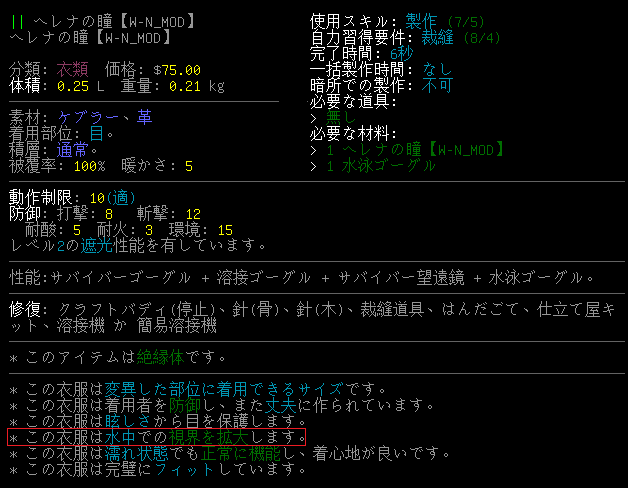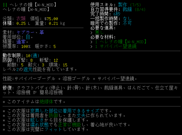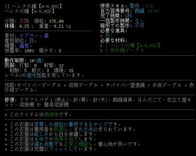 ヘレナの瞳が溶接ゴーグルの能力を得たぞ。『"flags":[FLASH_PROTECTION]』はjsonにコピーしないでおいた。RP用の自己満足ツールだからね。