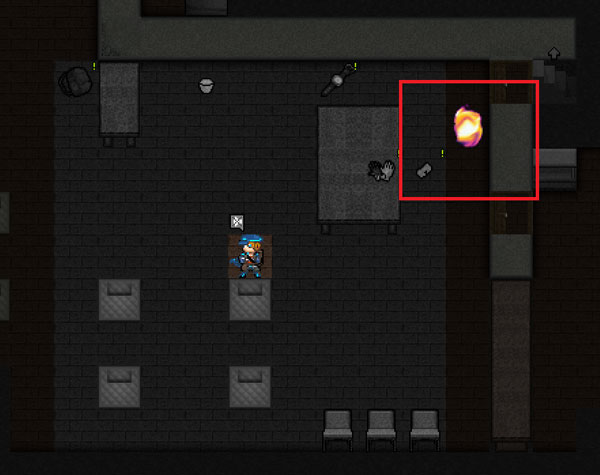 赤外線ゴーグルのフラグ("IR_EFFECT")があると暗闇で温血動物を感知できます(上の図)。ゾンビも感知できるけどロボットは無理みたい。しかも、上のような表示だと敵なのか味方なのか分かりづらい。