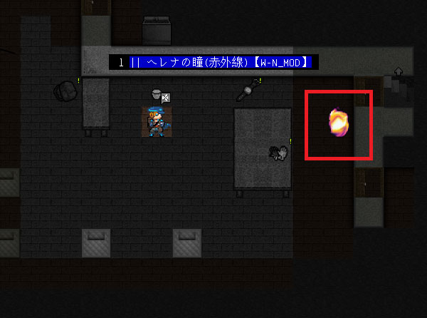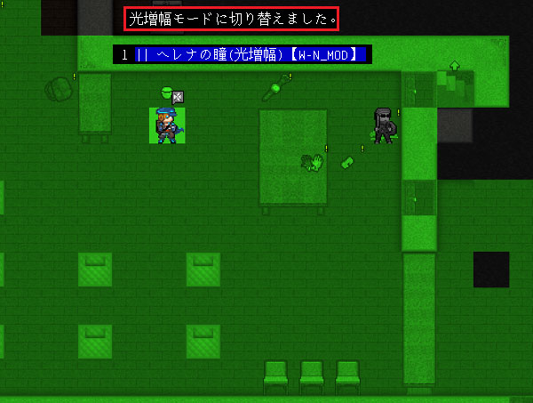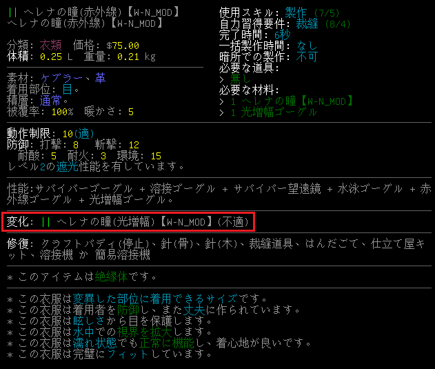 まあ性能の詳細は実験をして確かめればよろしい。ヘレナの瞳と光増幅ゴーグルを合体させます。『a』コマンドでヘレナの瞳を使用すると赤外線機能と光増幅機能が切り替わるようにしておきました。
