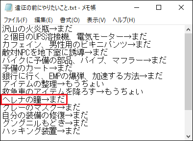 今回の投稿はここで終了します。現在の所持品と装備品は上の画像。ヘレナの瞳を所持していればサバイバー望遠鏡と消防士PBAマスクは不要になる。まあRP用のチート装備なので、望遠鏡や消防士PBAマスクは今までどおり持ち歩くことにするよ。