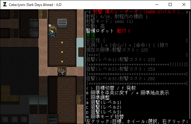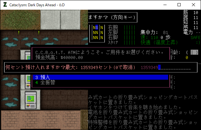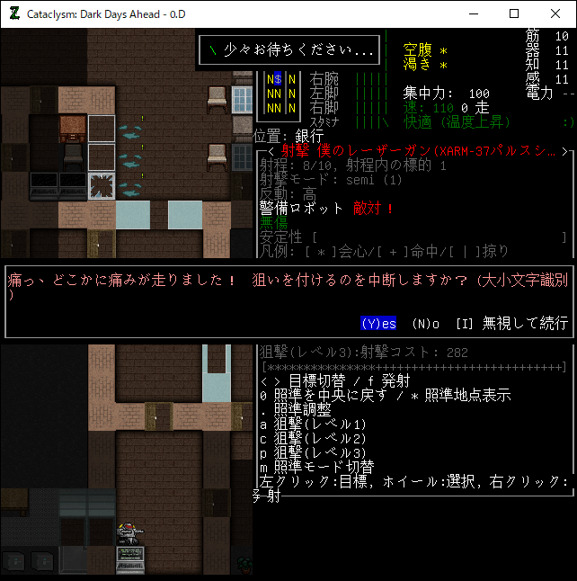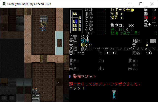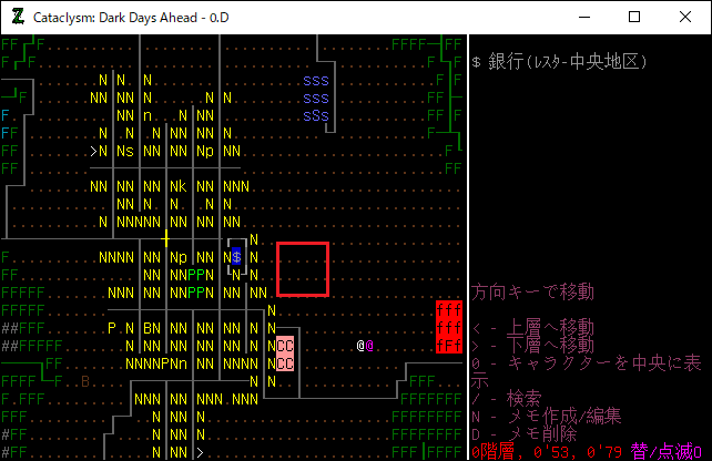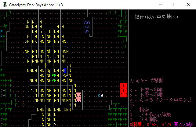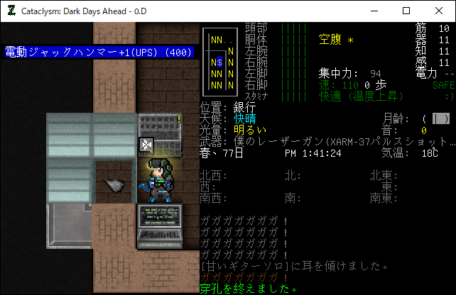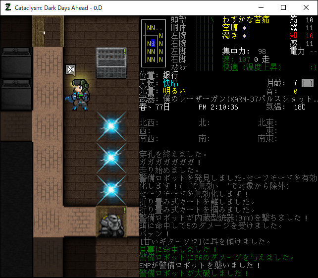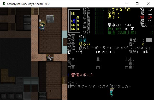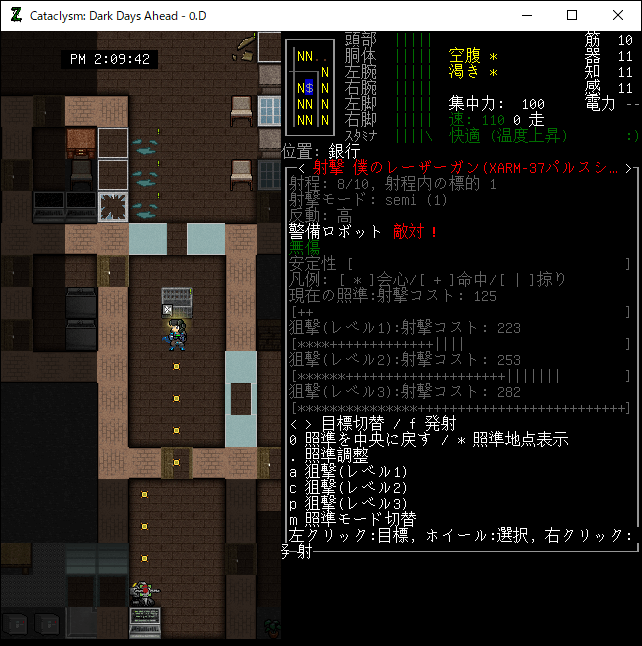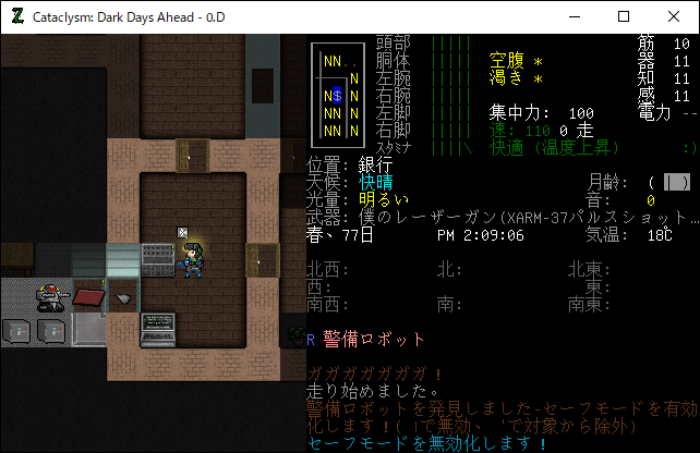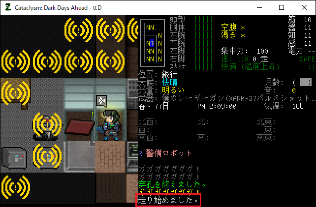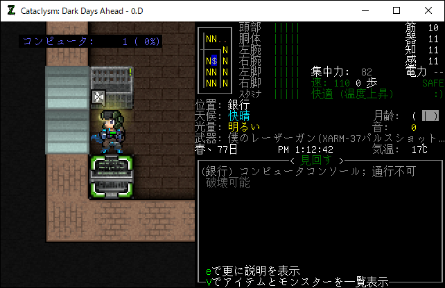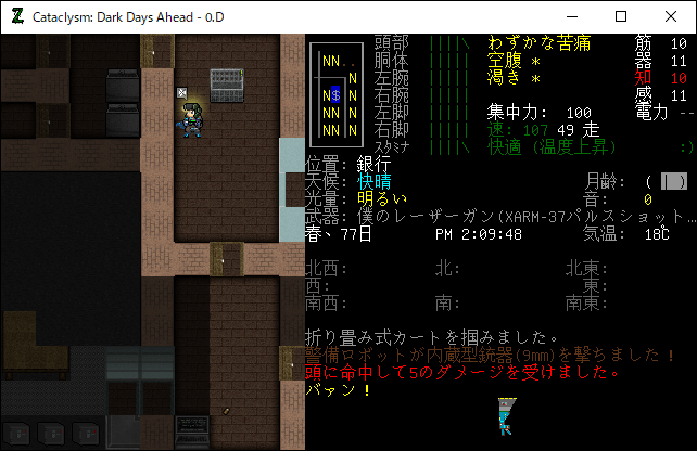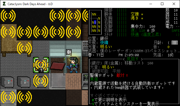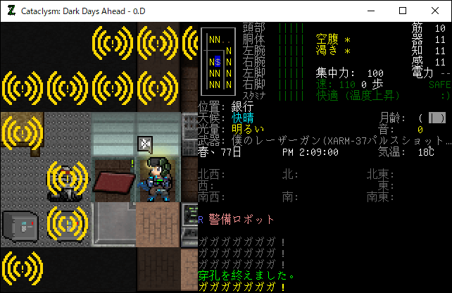 Cataclysmのプレイ日記を始めます。今日は銀行に行ってお宝を回収するぞ。前回は警備ロボットのために武器と防具を用意しました。勝てるかどうかは不明だが瞬殺されることは無いだろう。