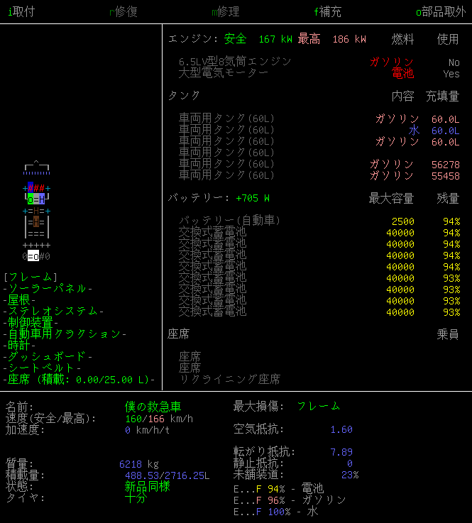 救急車の状態は上の画像。バッテリーが沢山あるし遠征の準備は万全だぜ。銀行の攻略に成功したら遠くの町を探索したい。