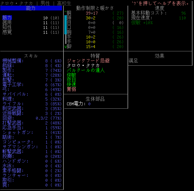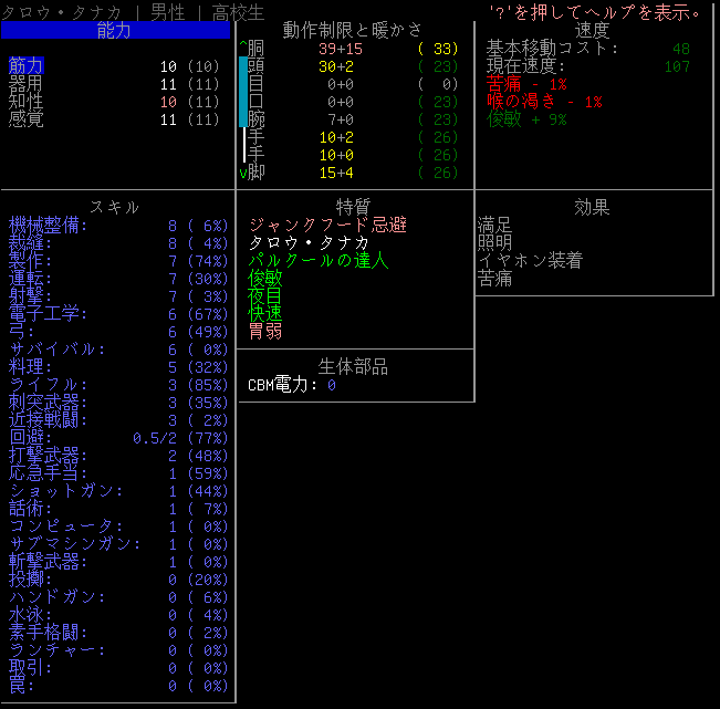 現在の能力値は上の画像。空腹と喉の渇きにより速度が下がっています。とはいえ食事をとる暇は無いだろう。乾燥肉を食べている隙に増援の警備ロボットから撃たれるかもしれない。そんなことになったら恥ずかしくてブログに書けません。