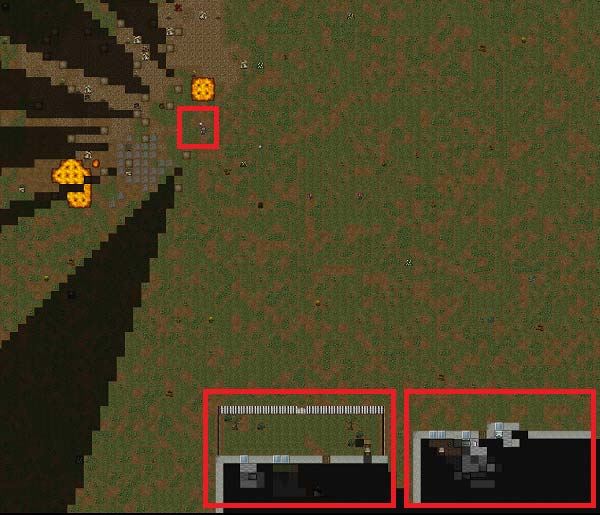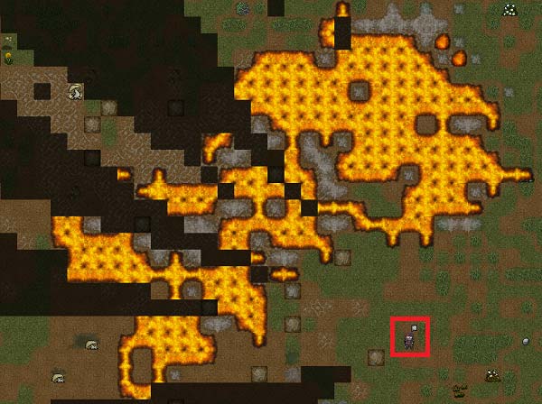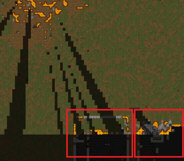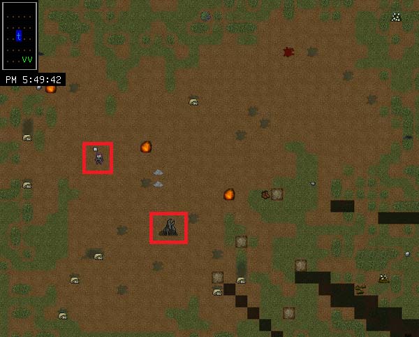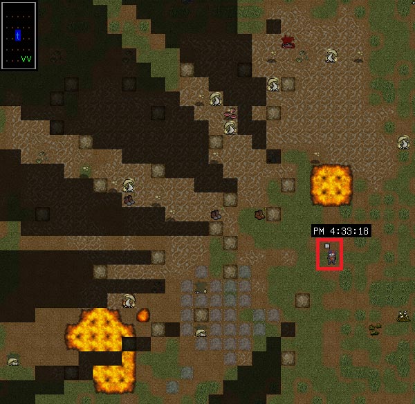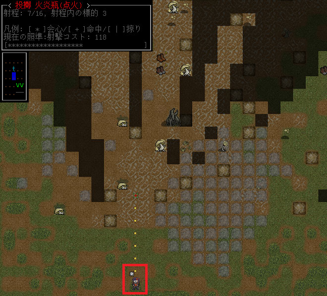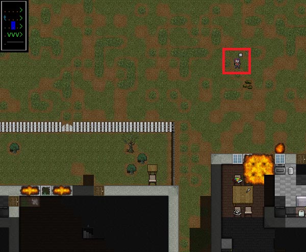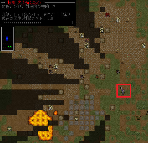 火炎瓶を南側の苗床にぶん投げました。CataclysmDDAの炎は強力すぎるので近づくと危険だ。序盤にふざけて森に火をつけたらそのまま死んだりするからな。
