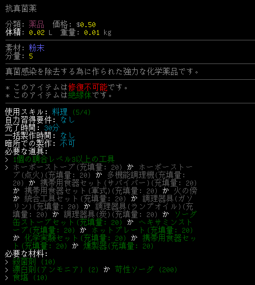 今回のプレイ日記は抗真菌薬を作って終わりにします。抗真菌薬は殺真菌ガス弾頭の材料にしたので枯渇しちゃった。この薬を所持せずに遠征するのは自殺行為だから作っておこうか。